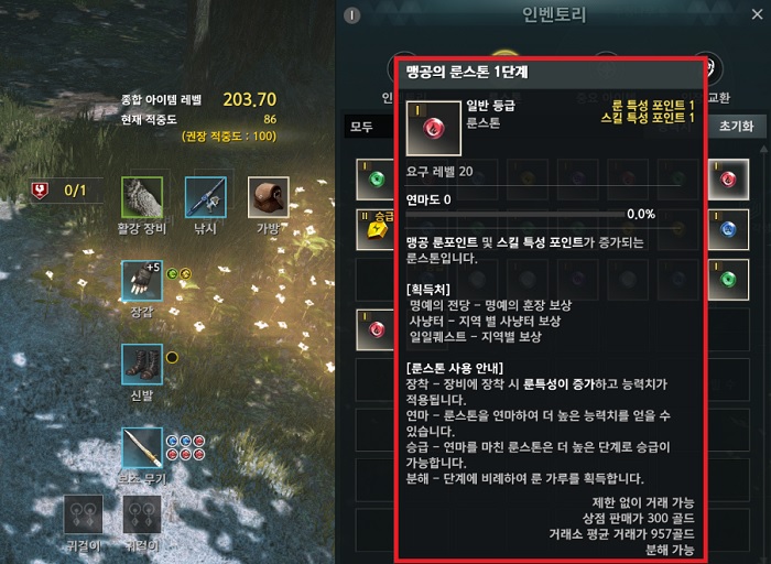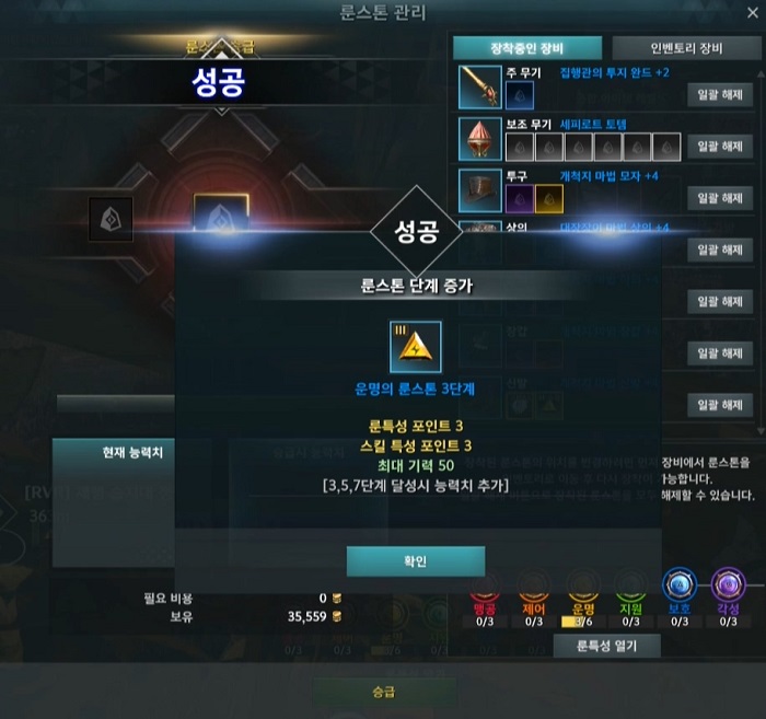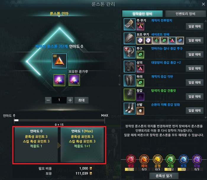 연마와 승급을 간편하게 정리하자면, 연마 시에는 룬가루가 필요하며 3단계 룬부터 최대 연마 시 룬스톤이 올려주는 능력치가 상승한다. 다음으로 승급 시에는 룬스톤이 제공하는 룬 특성 포인트와 스킬 특성 포인트가 증가한다고 이해하면 쉽다.