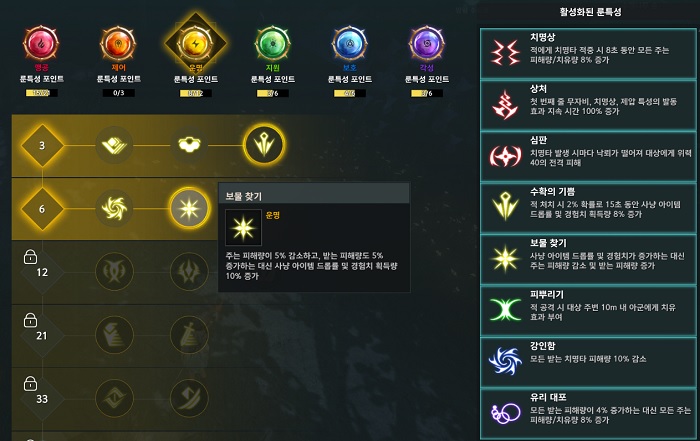 룬 특성에 대해서도 알아보자. 룬 특성은 앞서 언급한 바 있는 균형 룬스톤을 제외한 맹공, 제어, 운명, 지원, 보호, 각성 룬스톤이 각각의 포인트가 쌓이고 룬 특성 포인트를 3, 6, 21, 33, 48개를 모을 때마다 투자할 수 있다. 각 포인트 단계마다 하나의 룬 특성을 선택해서 투자할 수 있는데, 이를 통해서 다채로운 공격 혹은 방어 보조 효과를 얻을 수 있다.