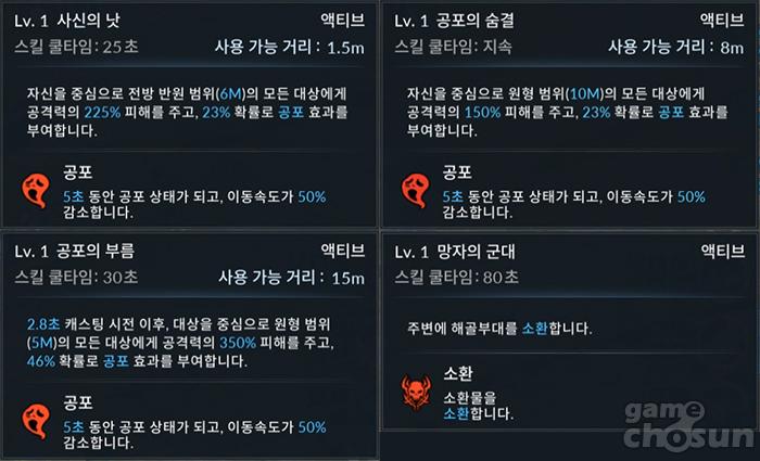 - 사신의 낫(스킬 쿨타임 25초): 자신을 중심으로 전방 반원 범위 6M의 모든 대상에게 공격력의 225% 피해를 주고, 23% 확률로 공포 효과를 부여한다. (공포: 5초 동안 공포 상태가 되고, 이동속도가 50% 감소한다.)