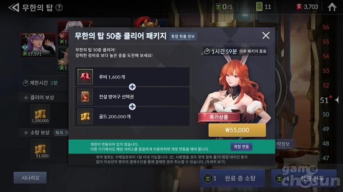무한의 탑 50층 클리어 시 등장하는 클리어 패키지 = 게임조선 촬영
