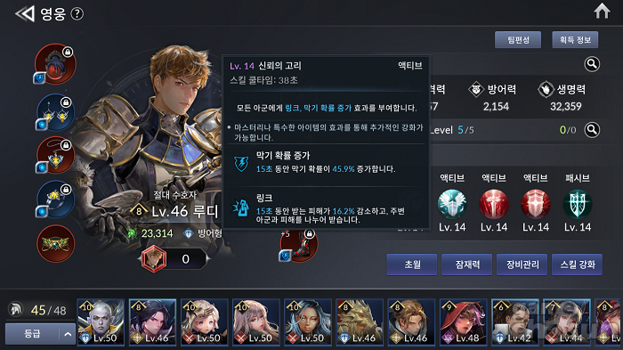 막기 확률 증가와 링크를 통해 파티의 생존력을 올리는 영웅도 존재한다.