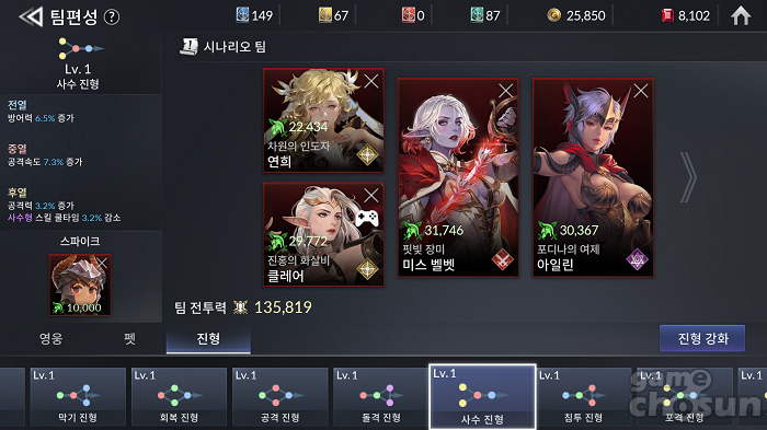 공격형을 2명 배치한다면 공격형 진형을 선택할 수 있다. = 게임조선 촬영