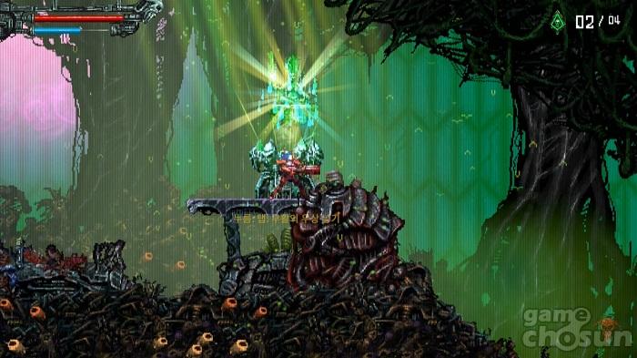 살점이 널부려져있는 고어와 그로테스크함 또한 도트로 구현되어 있어 깊이 들여다보지 않으면 파악하기 힘들 정도로 전투 흐름이 빠른 발파리스에선 적응할만한 수준이다.