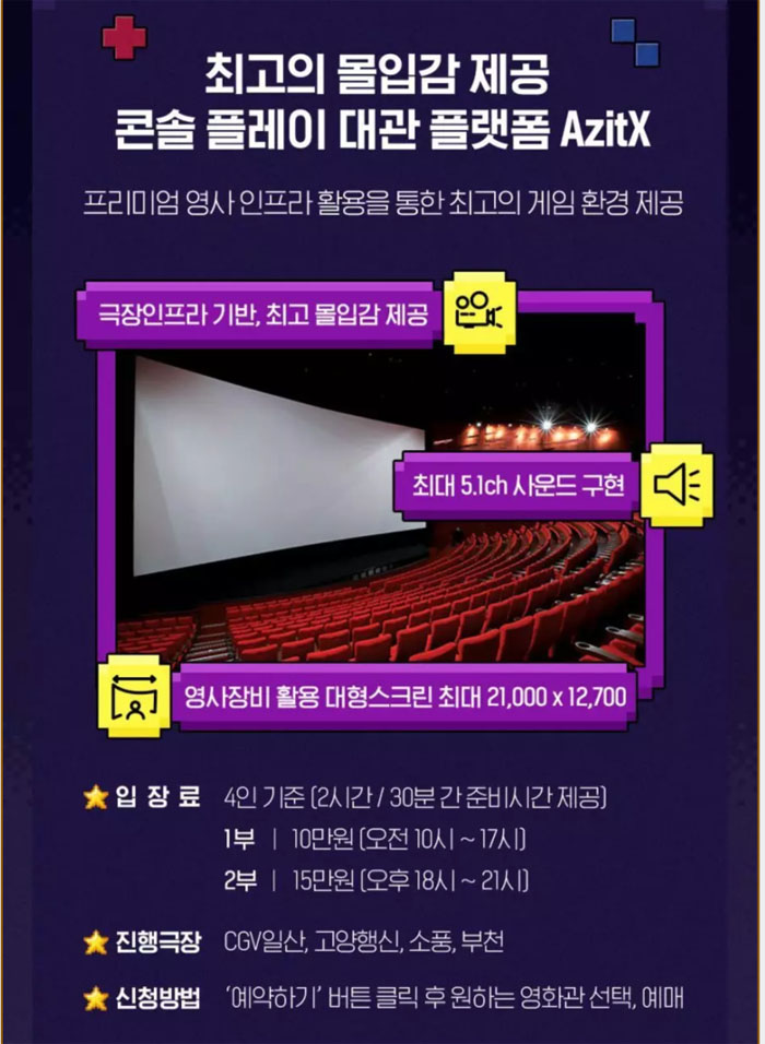 대형 멀티플랙스 영화관 CGV가 게이머를 위한 상영관 대관 서비스 '아지트 엑스(AzitX)' 서비스를 시작했다.