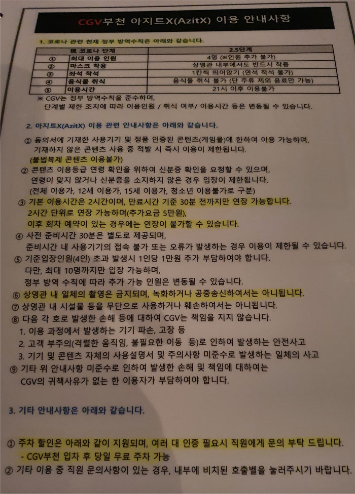 현재 코로나 방역 수칙에 따라 최대 4명만 입장 가능하며 상영관 내에서도 꼭 마스크를 착용해야 한다. 연석(바로 옆자리에 앉는 것) 및 음료를 제외한 모든 음식물 취식도 불가능하다.
