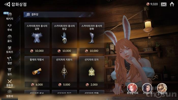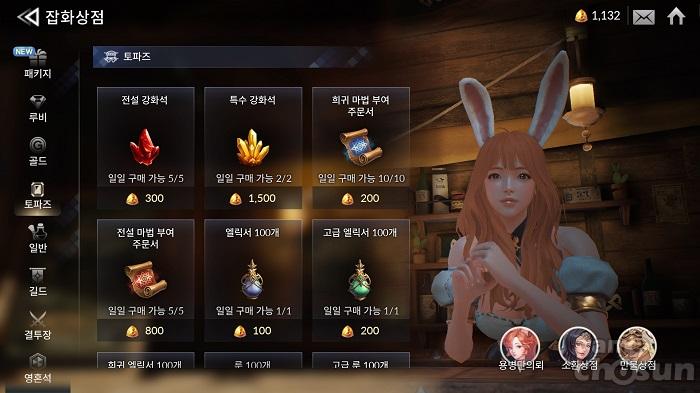 다양한 상품을 구매할 수 있지만 토파즈로 구매하는 상품은 '특수 강화석'이 추천된다. 매일 2개씩 구매할 수 있지만, 개당 토파즈 1,500개를 소모하기 때문에 사실상 매일 구매는 불가능하며, 토파즈가 모이는 족족 특수 강화석을 구매하는 것이 좋다.