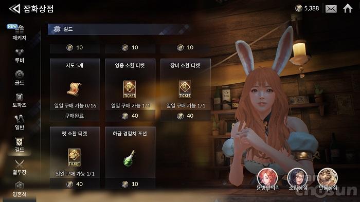 길드 포인트로는 8시간 동안 지속되는 공격력 버프, 방어력 버프, 생명력 버프를 구매할 수 있으며, 지도와 영웅 소환 티켓, 장비 소환 티켓, 펫 소환 티켓, 하급 경험치 포션을 구매할 수 있다.