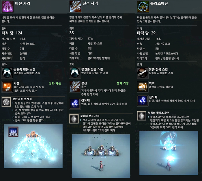 마지막으로 모든 스킬이 재사용 시간으로 사용 불가능할 때 쓸만한 '장총 연사'가 있다. 장총 연사는 단독으로도 쓸만하지만, 두 번째 특성인 '변환의 장총 연사'를 사용하면 피해량이 상승하는 동시에 빙결 효과까지 부여할 수 있어 스킬 연계에 도움이 된다. 40레벨을 달성한 후에는 곡사형 발사체 스킬인 '곡사 포탄', 특성은 전격 피해를 입히는 '변환의 곡사 포탄'을 사용하면 되겠다.