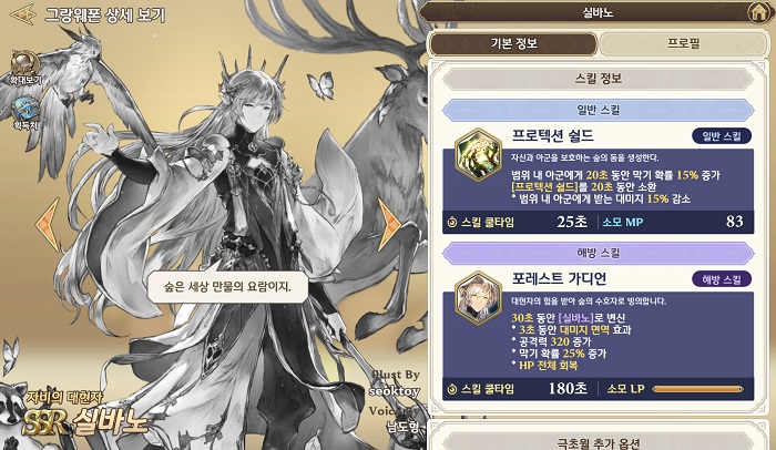 다음으로 '실바노'는 '아이샤'와 동일한 힐러 포지션의 그랑웨폰이며 딜러와 힐러를 겸할 수 있는 아이샤와 달리, 힐러로써 더욱 큰 역량을 보여준다.
