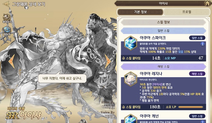 위에서 소개한 변신 가능한 그랑웨폰을 리세마라를 통해 획득 했다면 절반은 성공한 것이다. 이중에서도 '아이샤'는 최고의 인기를 얻고 있는 그랑웨폰으로, 파티원의 체력을 회복해줄 뿐만 아니라 공격력 증가 효과를 가졌다. 게다가 공격력 또한 준수하기에 필수 그랑웨폰으로 여겨지고 있다.