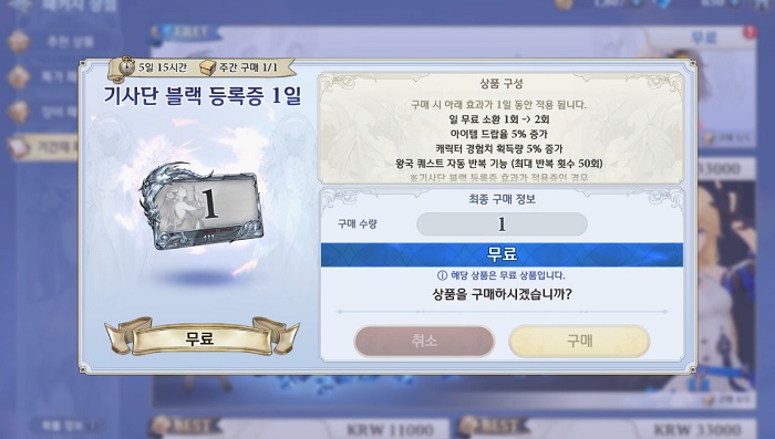 추가적으로 4회의 무료 소환, 즉 단차도 진행하는 것도 잊지 않도록 하자. 앞서 언급한 바 있는 우편 보상으로 주어지는 '성목의 열매' 1개와 다이아 3,000개로 10회 연속 소환을 진행했을 경우 업적 달성으로 주어지는 성목의 열매 1개, 그리고 매일 기본적으로 진행할 수 있는 무료 1회 소환이 있으며, '패키지 상품'의 '기간제 패키지'에서 무료로 구입할 수 있는 '기사단 블랙 등록증 1일'로 추가적으로 무료 1회 소환이 가능하다.