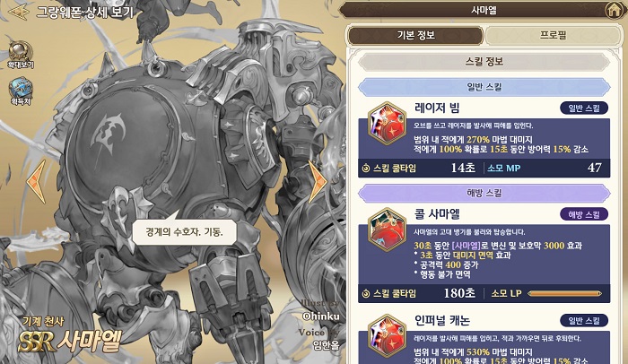 '사마엘'은 높은 범용성을 지닌 그랑웨폰인데, 딜러로써 활약할 뿐만 아니라 상대방의 방어력을 감소시키고 탱커 포지션으로도 활용 가능하기에 많은 이용자가 탐내는 그랑웨폰이다.