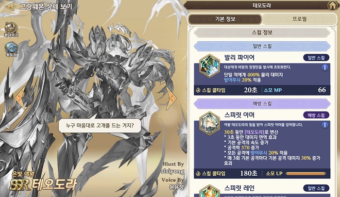 마지막으로 '테오도라'는 관통이 핵심인 그랑웨폰이다. 해방 스킬 사용 시 모든 공격에 방어 무시를 부여하고 공격 속도가 상승하기에 큰 효율을 낸다.