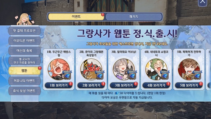 다이아 3,000개를 만들어 세 번째 무료 소환을 진행하기 위해서는 이벤트 탭의 '웹툰보기'를 완료하면 된다. 현재까지 총 8편의 웹툰이 공개된 상태인데, 해당 웹툰의 각 편을 감상할 때마다 50개의 다이아를 지급한다. 즉 총 400개의 다이아를 추가로 획득할 수 있는 셈이다.