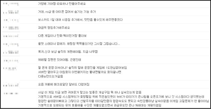 제가 활동하는 커뮤니티에 '라그오리진 아쉬운점좀 알려줘봐'라는 제목으로 게임에 대한 아쉬운 점을 모아놨습니다. 그라비티에서 확인을 한번 해줬으면 좋겠습니다.
