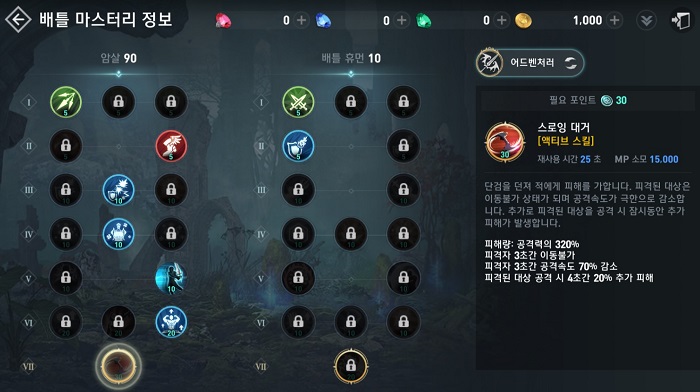 그리고 무기를 활로 교체해 평타로 공격을 하는 방식으로 운용합니다. 쟁이 빈번하게 발생하는 경우에는 배틀 마스터리 스킬 '스로잉 대거' 대신 '윈드 드라이브'를 장착해 이동 속도를 극대화하기도 합니다.