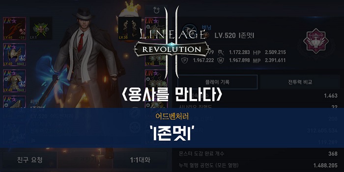 안녕하세요. 서버 이전을 하면서 몇 차례 캐릭터명 변경을 하긴 했으나, 리니지2레볼루션 오픈 첫 날부터 지금까지 쭉 플레이를 이어오고 있는 하딘 서버의 'I존멋I'이라고 합니다. 현재 어드벤처러를 주력으로 육성하고 있습니다.