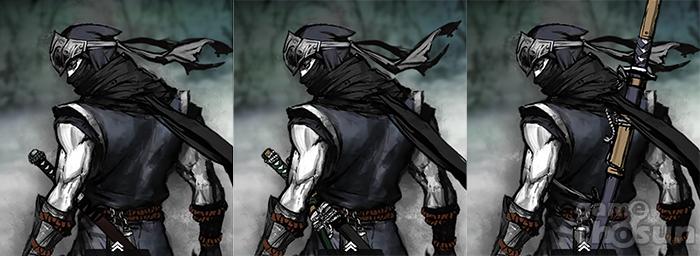 게임에 등장하는 무기는 검(좌측), 쌍검(중앙), 태도(우측) 3종이다.