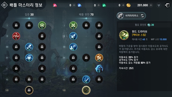 이동 속도가 느린 사지타리우스에게 빠르게 안전한 포지션에 안착할 수 있게 도움을 주고 평타 DPS를 비약적으로 올려주는 '윈드 드라이브'를 기용하여 '집중 30'과 '배틀 휴먼 70'으로 투자해서 사용 중에 있습니다.