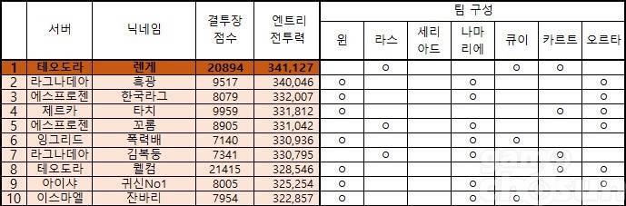 결투장 종료 시점 기준 전 서버 전투력 1위를 달성한 '렌게' = 게임조선 작성