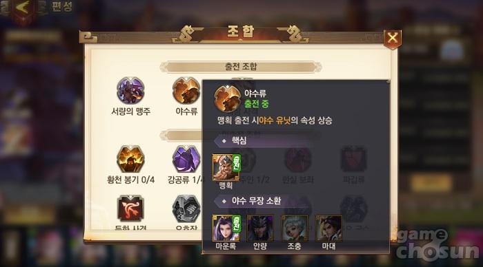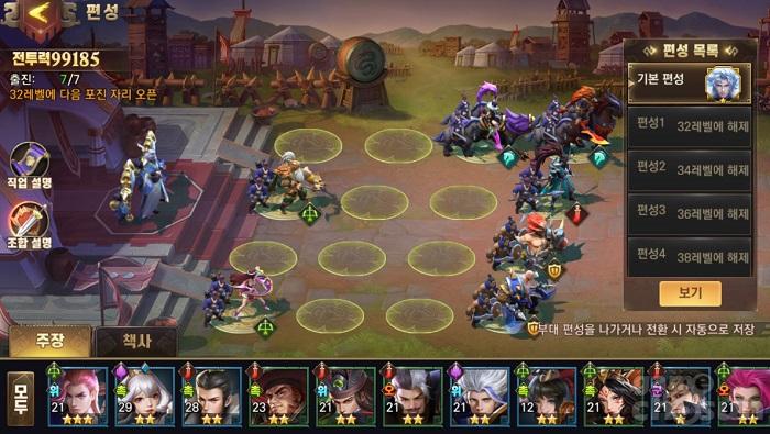이용자는 무장과 병종 타입에 따라서 최대 16개의 위치에 부대를 배치 가능한데, 최전방에는 방패병 혹은 보병을, 그리고 2열 혹은 3열에는 경기병 또는 중기병을, 마지막으로 최후방에는 궁수 및 모사 부대를 배치해 상대방과 전략적인 전투를 펼치게 된다.