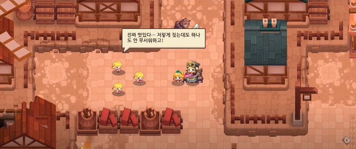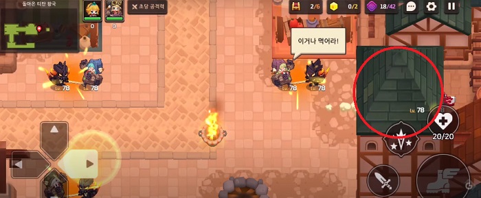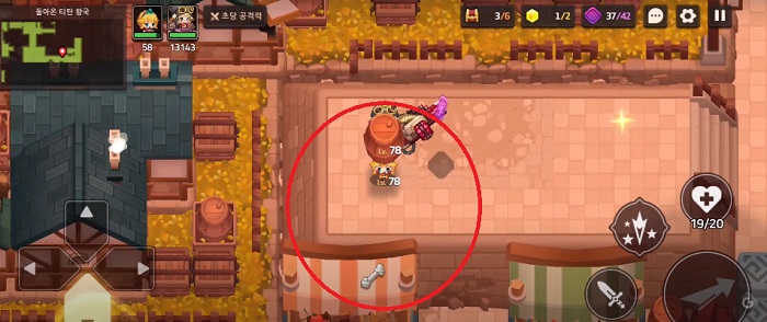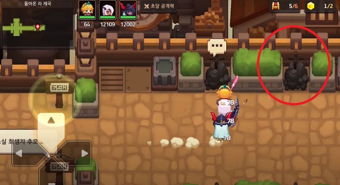 이번 스테이지에서 이용자들이 가장 헤매는 것이 바로 강아지를 퇴치하는 것이다. 맵 중반부에는 특정 NPC가 자신의 동생 3명을 찾아달라고 부탁한다. 동생 3명을 구출하기 위해서는 '개껌'이 필요한데, 해당 개껌은 아래 이미지에서 획득 가능하다. 개껌은 이미지와 같이 캐릭터가 닿을 수 없는 곳에 위치해 있는데, 이동시킬 수 있는 나무통을 들고 와서 개껌을 향해 던지면 개껌이 지붕 아래로 떨어지고 획득 가능해진다.
