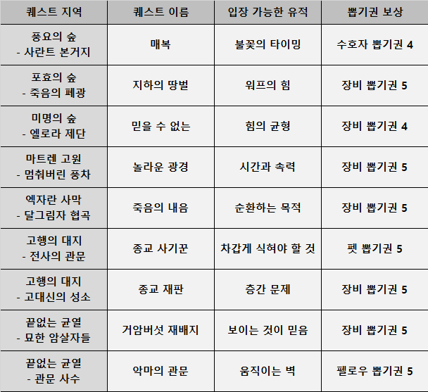 뽑기권을 주는 서브 퀘스트는 총 9개로 초반 지역인 브라카르 숲을 제외하고 최소 한 개씩 준비되어 있다. 풍요의 숲 지역부터 부상당한 경비병에게 시작해 연속으로 이어지는 서브 퀘스트가 등장하는데 이 경우 유적을 입장하게 된다.