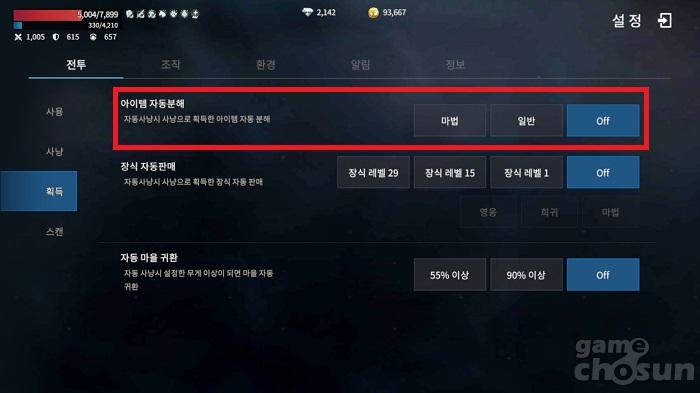 설정>전투>획득에서 아이템 자동분해를 설정할 수 있다. = 게임조선 촬영