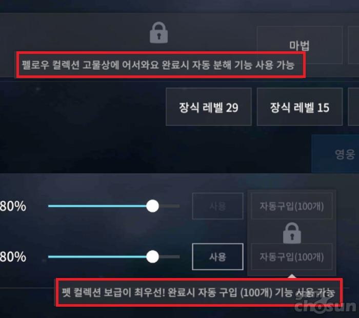 설정에 들어가서 자동 구입 기능과 자동 분해를 사용하려고 보면 컬렉션이 완료돼야 한다는 문구를 볼 수 있다. = 게임조선 촬영