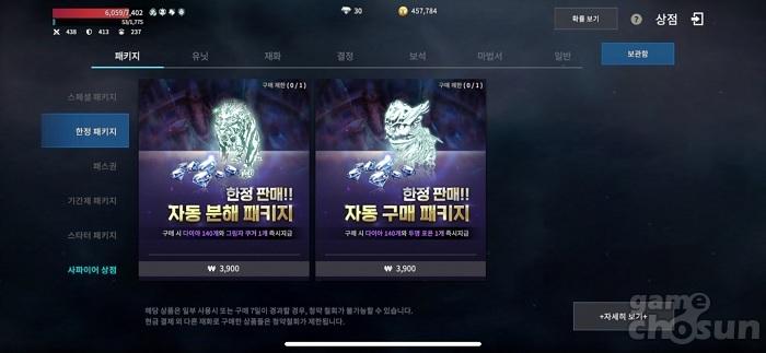 상점에서 판매 중인 '자동 분해 패키지'와 '자동 구매 패키지' = 게임조선 촬영