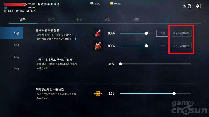 설정>전투>사용에서 자동 구입 기능을 온오프 할 수 있다. = 게임조선 촬영