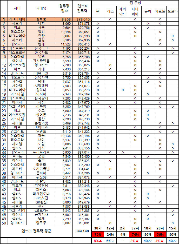 각 서버별 결투장 점수 기준 TOP 5를 모은 후 엔트리 전투력 기준으로 나열한 전 서버 TOP 50위 유저들의 모음이다.