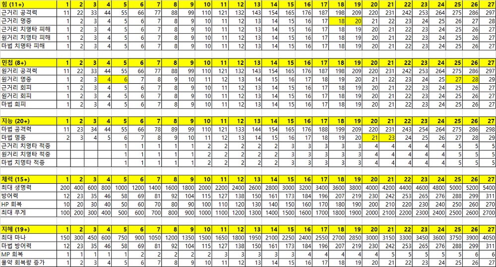 이에 따라 5개 스탯으로 얻을 수 있는 능력치를 확인해 봤다.