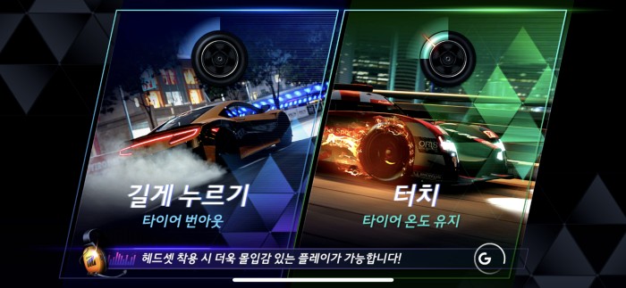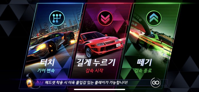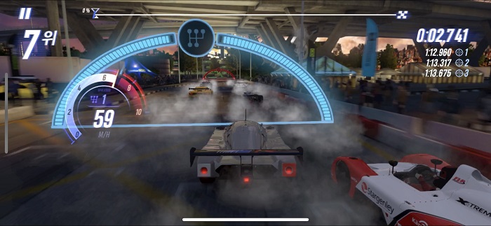 그리고 본격적인 레이스가 시작되면 3종류의 색상으로 표시된 특정 지점을 계속해서 만나게 된다. 우선 옅은 파란색의 지점은 속도를 높이기 위해 변속을 해야하는 타이밍으로, 차량이 해당 지점을 통과하는 순간에 화면을 1회 터치해주면 된다.