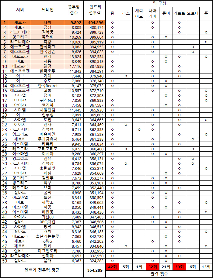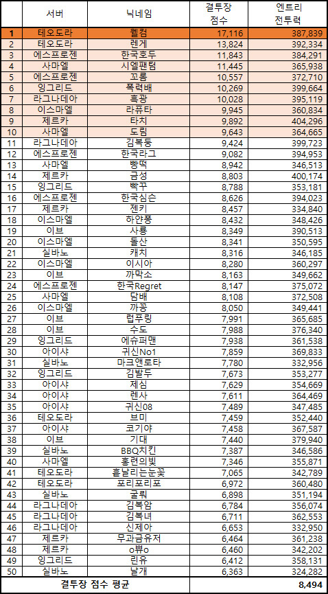 각 서버별 결투장 점수 기준 TOP 5를 모은 후 엔트리 전투력 기준으로 나열한 전 서버 TOP 50위 유저들의 모음이다.