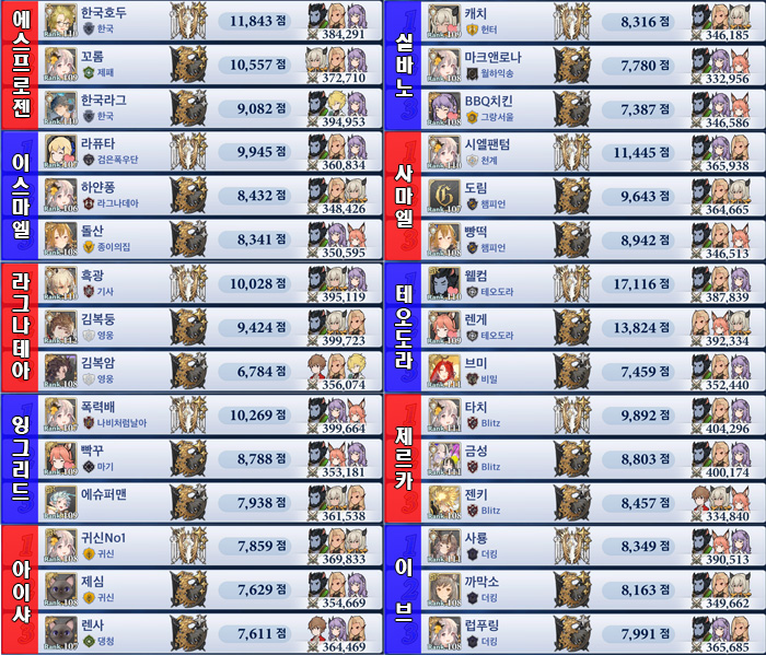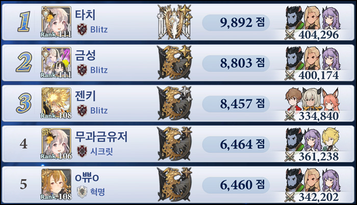 * 전투력 등 각종 순위는 결투장 랭킹 TOP5에 입성한 게이머 기준이므로 누락된 게이머가 있을 수 있습니다.*