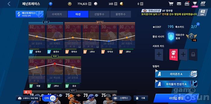 라인업 관리를 좀 더 자세히 살펴보자면 타선을 상위 2명, 클린업 3명, 하위 4명의 타선으로도 배치할 수 있지만 상위 3명, 클린업 3명, 하위 3명으로 변화를 주는 등의 운영도 할 수 있다. 뿐만 아니라, 라인업 내에서는 각 선수의 스태미나와 컨디션 등을 확인하고 관리할 수 있을 뿐만 아니라 최근 성적을 한 눈에 볼 수 있는 그래프도 제공하므로 매우 편리하다.