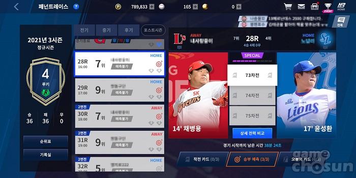 페넌트레이스에서 가능한 '승부 예측'과 '오늘의 카드'도 또다른 재미 중 하나다. 경기 중 '첫 에러', '첫 볼넷', '첫 홈런' 등이 어떤 팀에서 먼저 나올지 예상해 선택할 수 있는데, 이를 적중시킬 경우 추가적인 보상이 주어진다. '오늘의 카드' 또한 전력 분석을 통해서 경기 결과를 예상하는 시스템인데, 역전승 혹은 역전패, 일정 점수 이상 차이 승리 등을 예상해 맞추면 푸짐한 보상이 제공된다.