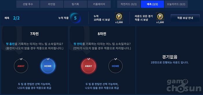 승부예측은 현재 페넌트레이스의 진행 예정인 경기에 대해서 미리 특정 조건을 예상하는 시스템인데, '홈 & 어웨이' 중 하나를 선택하기만 하면 된다. 하루 3회만 진행하면 되므로 쉽게 클리어할 수 있는 일일 미션이지만 주의해야할 점이 한 가지 있다.