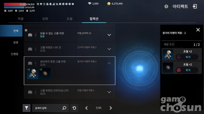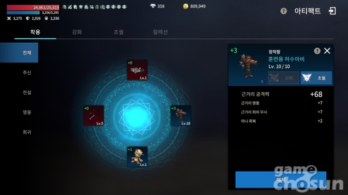 연관된 아티팩트끼리 모이면 추가 능력치 제공 = 게임조선 촬영