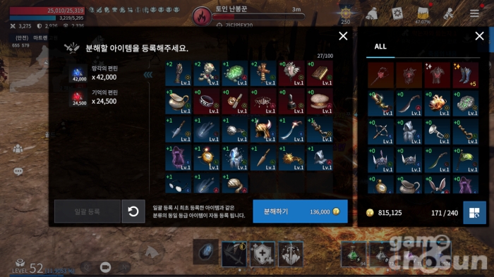 분해는 가방에서 다른 아이템과 같이 평범하게 가능하다 = 게임조선 촬영
