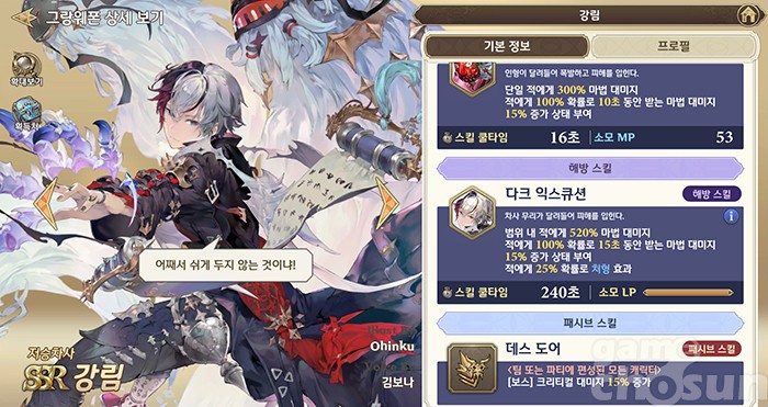 일반 스킬, 해방 스킬, 패시브 스킬 모두 사냥에서 무난히 쓸만한 효과 = 게임조선 촬영