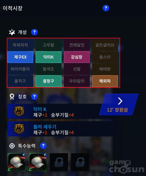 각 선수의 특징에 따라 다르게 존재하는 특수 스텟이다. 별 표시가 있는 블록 해제 시 활성화되며 포지션, 선수별로 획득 가능한 개성의 목록이 다르다.