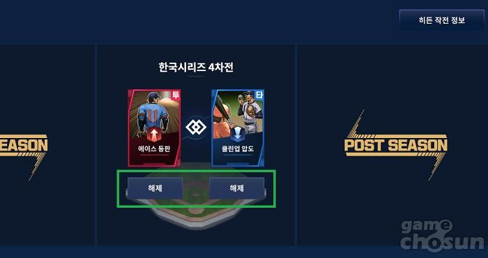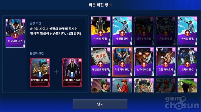작전카드는 각 경기마다 최대 2장을 배치할 수 있는데, 특정 작전 카드 조합을 맞출 경우에 '히든 작전'이 발동돼 추가적인 변수를 만들어내는 것이 가능하다. 예를들어 '에이스 등판'과 '클린업 압도' 작전카드를 함께 사용하면 '나의 승리다!' 히든 작전이 발동되며, 기본 작전카드의 효과와 더불어 '2사 풀카운트 상황에서 탈삼진 확률이 상승'하는 효과까지 얻을 수 있다.