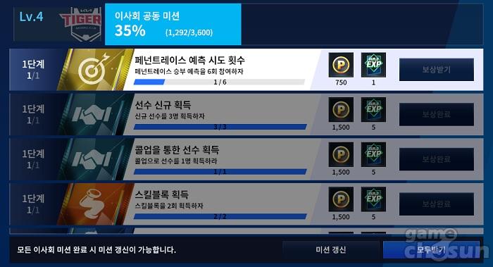 이사회 미션는 총 5개로 구성돼 있는데, 모든 미션을 완료했을 경우 '미션 갱신'을 통해 동일한 미션을 다시금 수행이 가능하다. 즉 자신의 이사회를 빨리 성장시키기 위해서는 미션 갱신을 얼마나 많이 진행하느냐가 관건이라고 할 수 있다. 이때, 몇몇 미션으로 인해서 하루 진행 가능한 갱신에 제한이 있는데, 대표적으로 '리그 투어 2회 진행'과 '페넌트레이스 승부 예측 6회 참여'다.