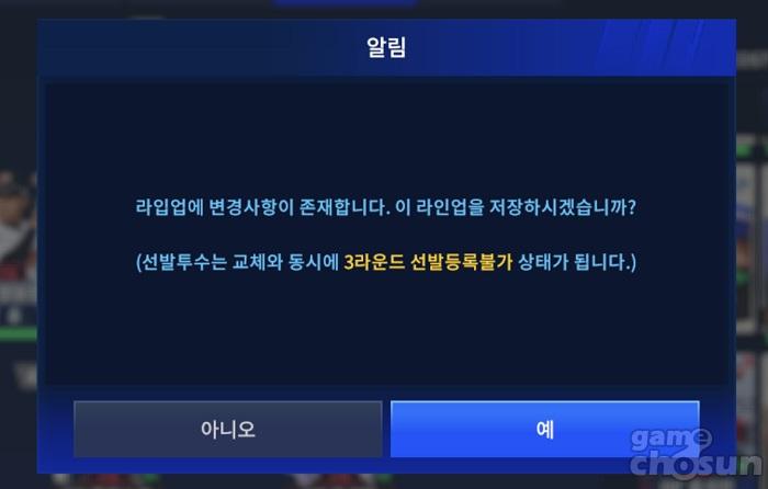 휴식기일 경우에는 라인업에 등록된 선발 투수를 모두 후보 투수로 교체하고 게임의 메인 화면으로 이동했다가 다시금 라인업 편집으로 돌아오면 자신이 원하는 순서대로 선발 투수를 배치 가능하다.