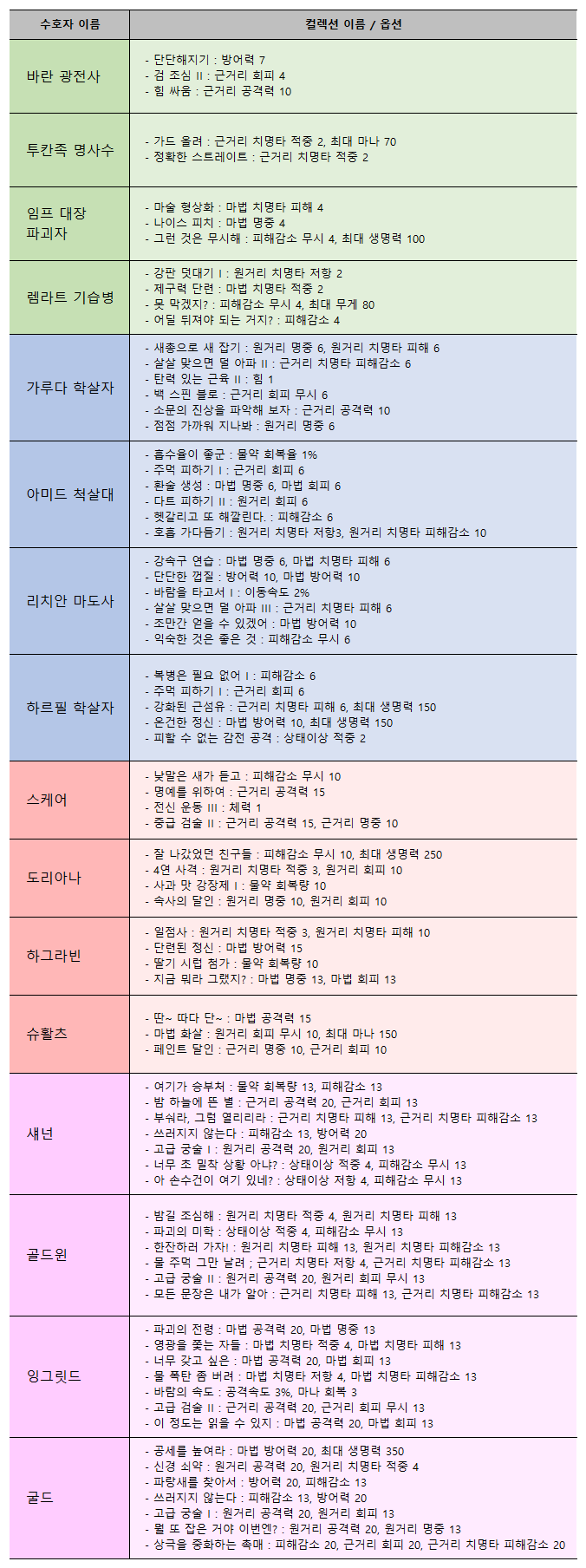 다음은 명예코인으로 제작하는 기물을 요구하는 컬렉션을 정리한 표다. 같은 등급 기물을 제작할 땐 동일한 양의 명예코인을 요구하니 해당 표를 보고 자신에게 필요한 옵션을 정해 우선 순위를 결정하도록 하자.
