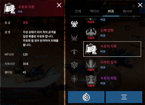 수호의 지휘는 명예 코인으로 제작할 수 있는 가디언의 영웅 등급 버프형 자동 공격 스킬이다. 쿨타임 45초에 MP 120을 사용하며 30초 동안 회피 확률을 올려주고 회피 시 자동 반격하는 스킬이다.