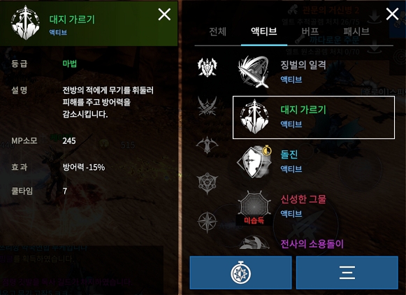 가디언은 직업 특성상 MP가 그렇게 여유로운 편은 아니기에 스킬 두 개를 쿨타임마다 돌리기도 번거로운 경우가 대다수이다. 다수 공격에 연계 스킬 습득 시 방어력 감소까지 주어지는 대지 가르기를 1순위로 자동 사용에 올려두고 나머지 스킬을 어느 정도 사용 주기 설정을 맞춰두는 편이 좋다.