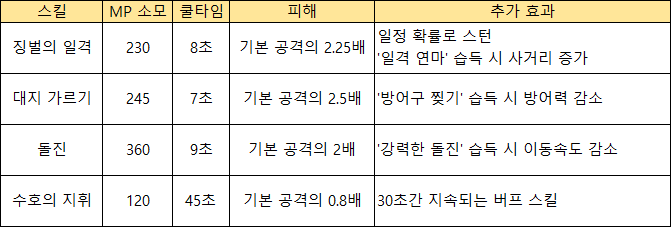 이에 가장 무난하게 획득할 수 있는 징벌의 일격과 대지 가르기를 포함해 가디언의 희귀 등급 액티브 스킬 '돌진'과 영웅 등급 명예 코인 제작 스킬 '수호의 지휘'를 서로 비교해 보았다.